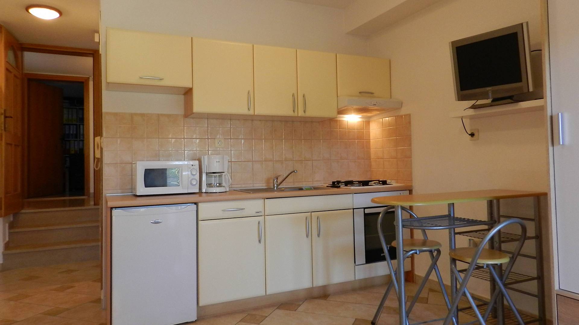 Apartment studio (30 m2) consist of short hall, one room with kitchen, terrace (9 m2) with exit to courtyard. It is suitable for two persons.